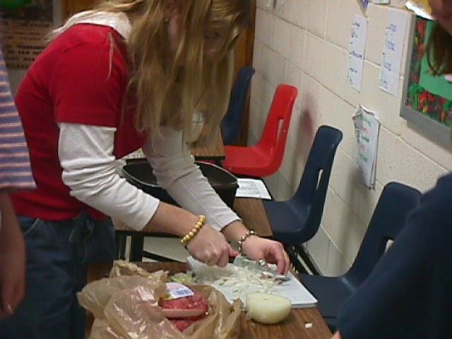 Ogden student cutting onion for Picadillo