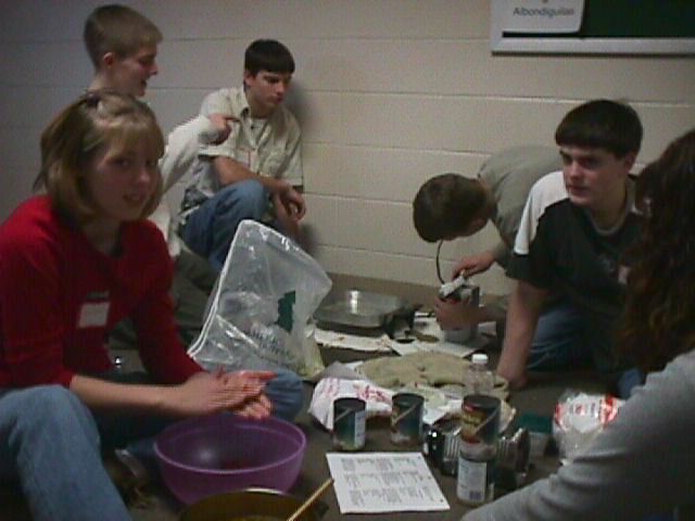 Students preparing Sopa de Albondiguitas: (Be Jota) BJ Smith, (Roberto) Jayson Caudle, (Tortuga) Paul Pratt