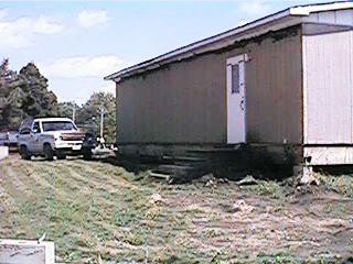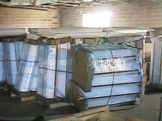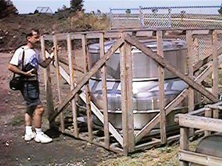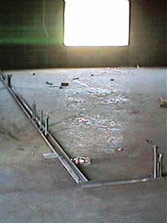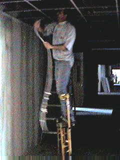 This dark photo shows a worker on stilts pulling wiring for the tv/vcr in each classroom.