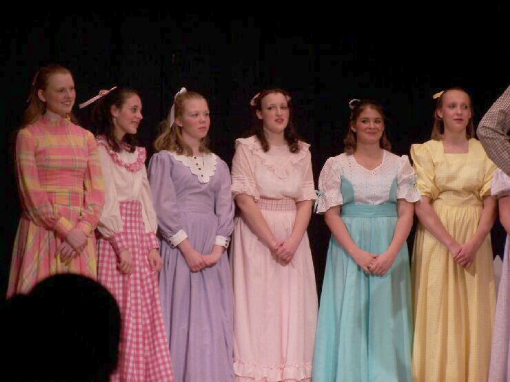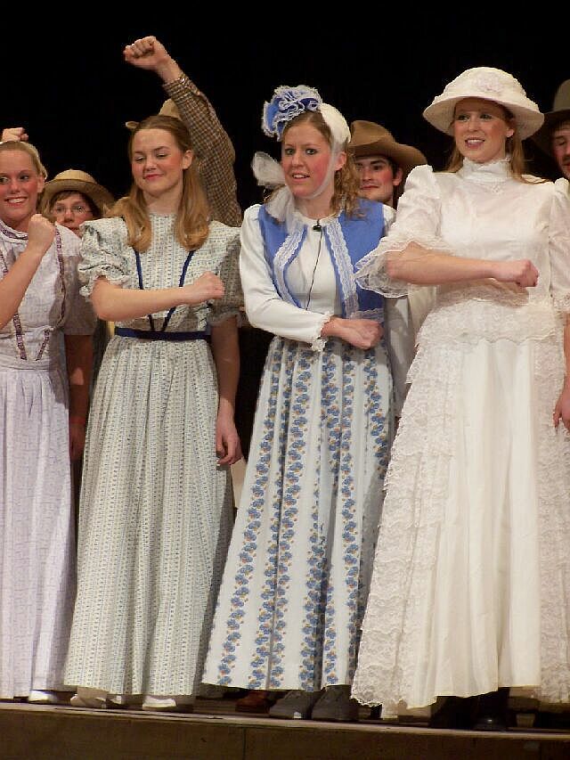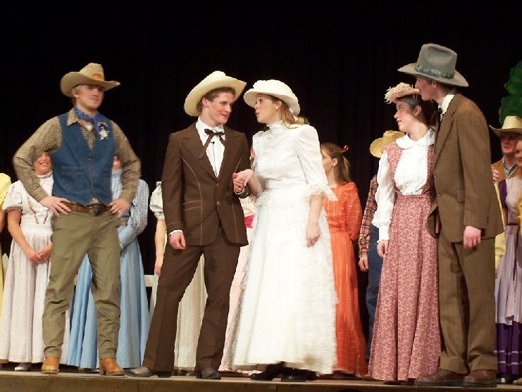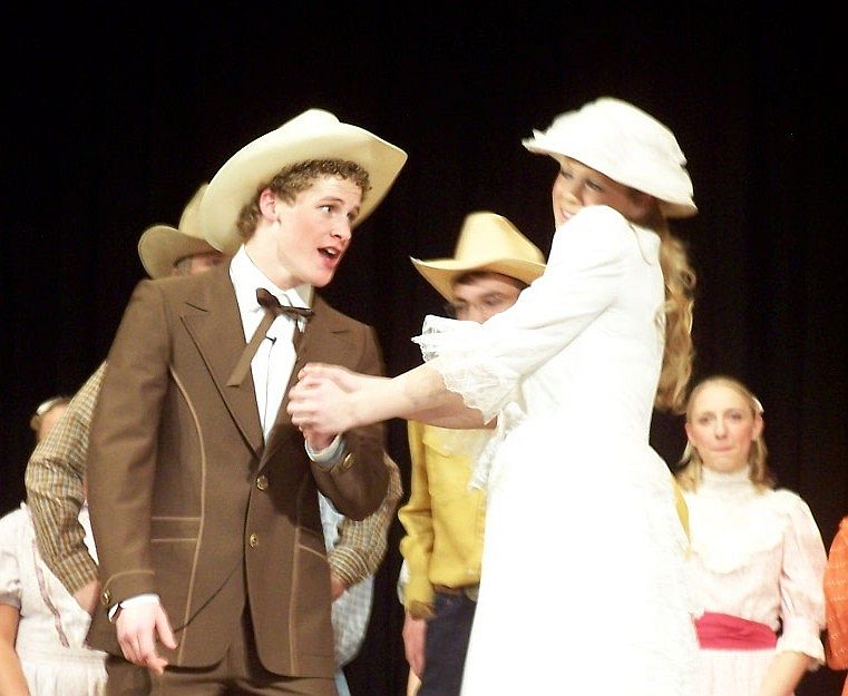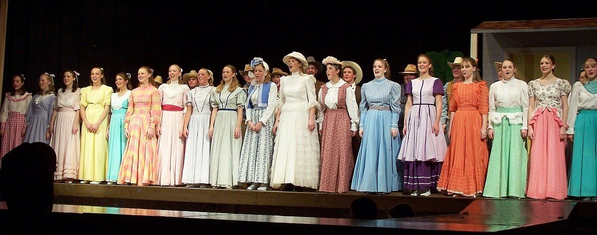 The story of Oklahoma! is about a young woman named Laurey and her Aunt Eller who live in the Indian Territory in the early 1900s. As the story evolves, the main question becomes who will take Laurey Williams to the box social, Curly McClain, the cowboy, or Jud Fry, the hired hand? Laurey's lighthearted friend, Ado Annie, and Ado's boyfriends, Will Parker and Ali Hakim, do their best to ease the tension, but Laurey will have to choose. The show opens with Oh, What a Beautiful Morning and features other wonderful songs such as The Surrey with the Fringe on Top, The Farmer and the Cowman, and finally, Oklahoma!.