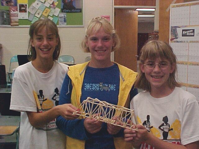 The challenge was to build a model bridge by gluing wooden toothpicks together and then to measure the strength of that model by seeing how much force the bridge can stand before it breaks. Pictured are the winning team of Ariana Wolf, Jenna Krause, and Sarah Carlson. Their model withstood 22 pounds of pressure before fracturing several braces. The second place bridge withstood 20.9 pounds of stress.