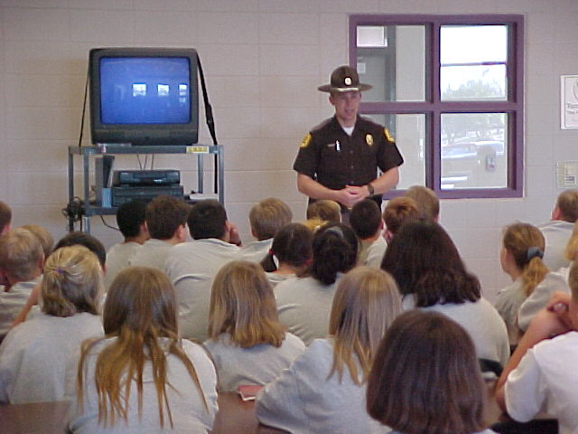 Patrolman Hove spoke to the students about his job serving in the Corning area. He showed a tape demonstrating the training routine officers undertake and told of some of his experiences before answering questions from students.