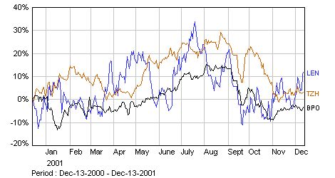 Chart shows the closing prices of Brookfield Properties, Lennar, and TrizecHahn for the past year.