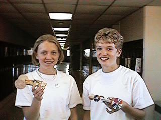 Mr. Nelson's 8th Grade Industrial Technology exploratory class has a unit for making and racing mousetrap powered model cars. After completing the races with their cars made from kits, students are invited to construct a model car more from scratch. Students must cut the shapes as well as glue them together. Pictured below are some of the students with their decorated cars.