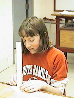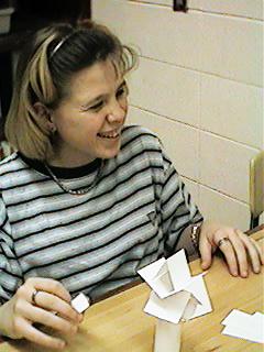 Amanda, the eventual winner at 38 inches, plans her three sided tower.