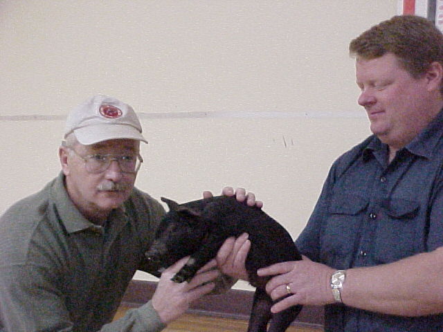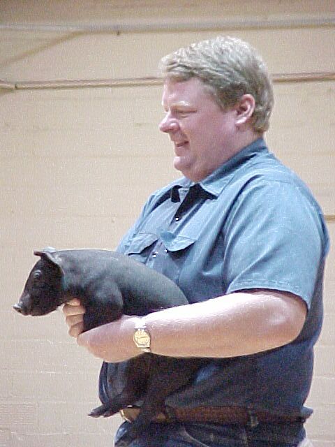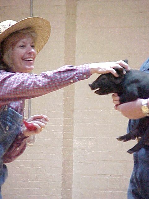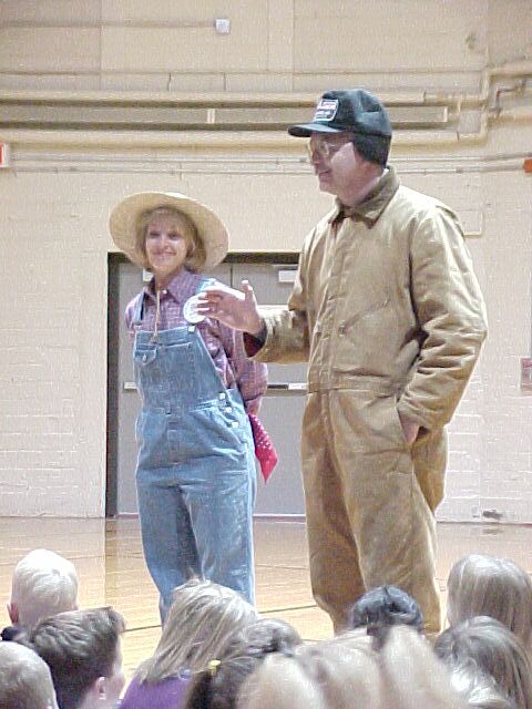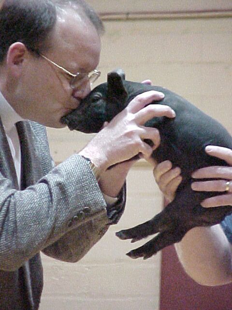 Since students recorded 293,746 minutes, greatly surpassing their goal, the teachers receiving the most votes were on hand ready to pucker up. Shown above are Mrs. Walker, female teacher receiving the most votes, and Burt Vust, representing top male vote-getter, Ivan Vust. Burt, Ivan's identical twin brother, told students that Ivan was afraid to come kiss the pig. When students made a loud protest, Burt left to find his brother, who finally came to face up to the horrible task.