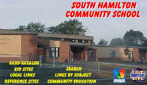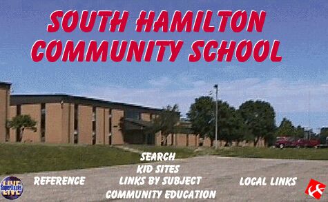 When the website used this image, there would also be the menu graphic at the left of this image. Above, you can see three of the four different versions that were used through the years. This menu graphic was always seen, no matter what page would be visible. This menu portion could take web visitors to the "home", the page "About" South Hamilton School, the "Board" page, the "Guidance" links, the current year's "Activity Page", the school "Schedule", and "Personnel" pages of photos and staff information, and lastly, access to the student "Handbook". You could click and go places on the South Hamilton Website or beyond.