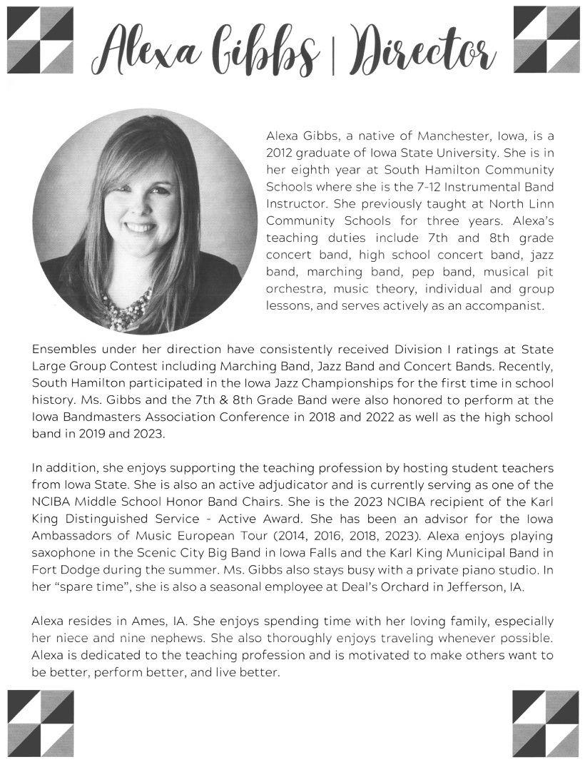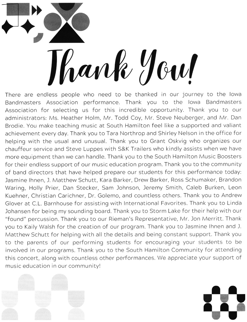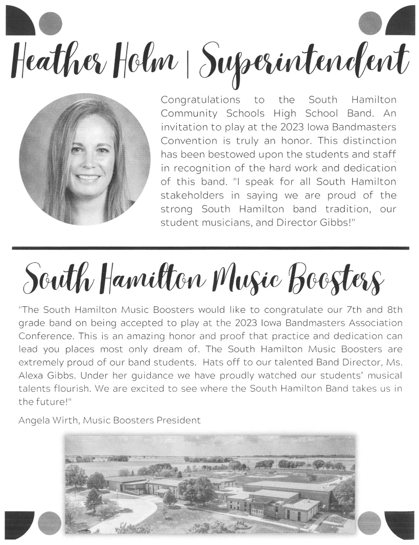 The Iowa Bandmasters Association (IBA) had selected the South Hamilton High School Band to perform in the Iowa Ballroom of the Downtown Des Moines Marriott for the IBA Conference on May 13, 2023.