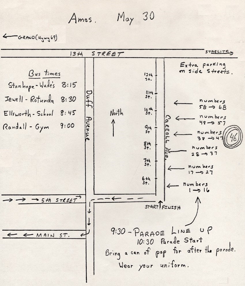 The 1987 South Hamilton Middle School Marching Band and other parade entries lined up close to Beardshear School. All entries not leading the parade then walked for many blocks until it was their turn to cross Duff and begin marching.