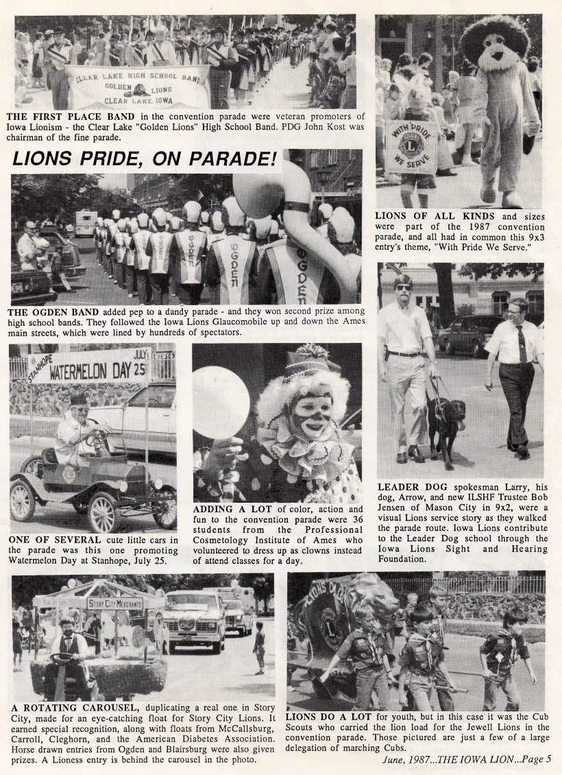 On May 30, 1987, the Iowa Lions Clubs met in Ames for their state convention. People watched the Lions State Convention Parade on Ames Main Street and Fifth Street.