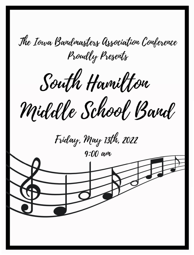 The South Hamilton Record News ran this 2022 article: The Iowa Bandmasters Association (IBA) has selected the South Hamilton Junior High Concert Band to perform at the IBA Conference at the Des Moines Marriott in May. Through a plind audition process, the band was selected as the best 1A-2A junior high band in Iowa. Congratulations to the South Hamilton Junior High Concert Band and Director Alexa Gibbs on this huge honor!