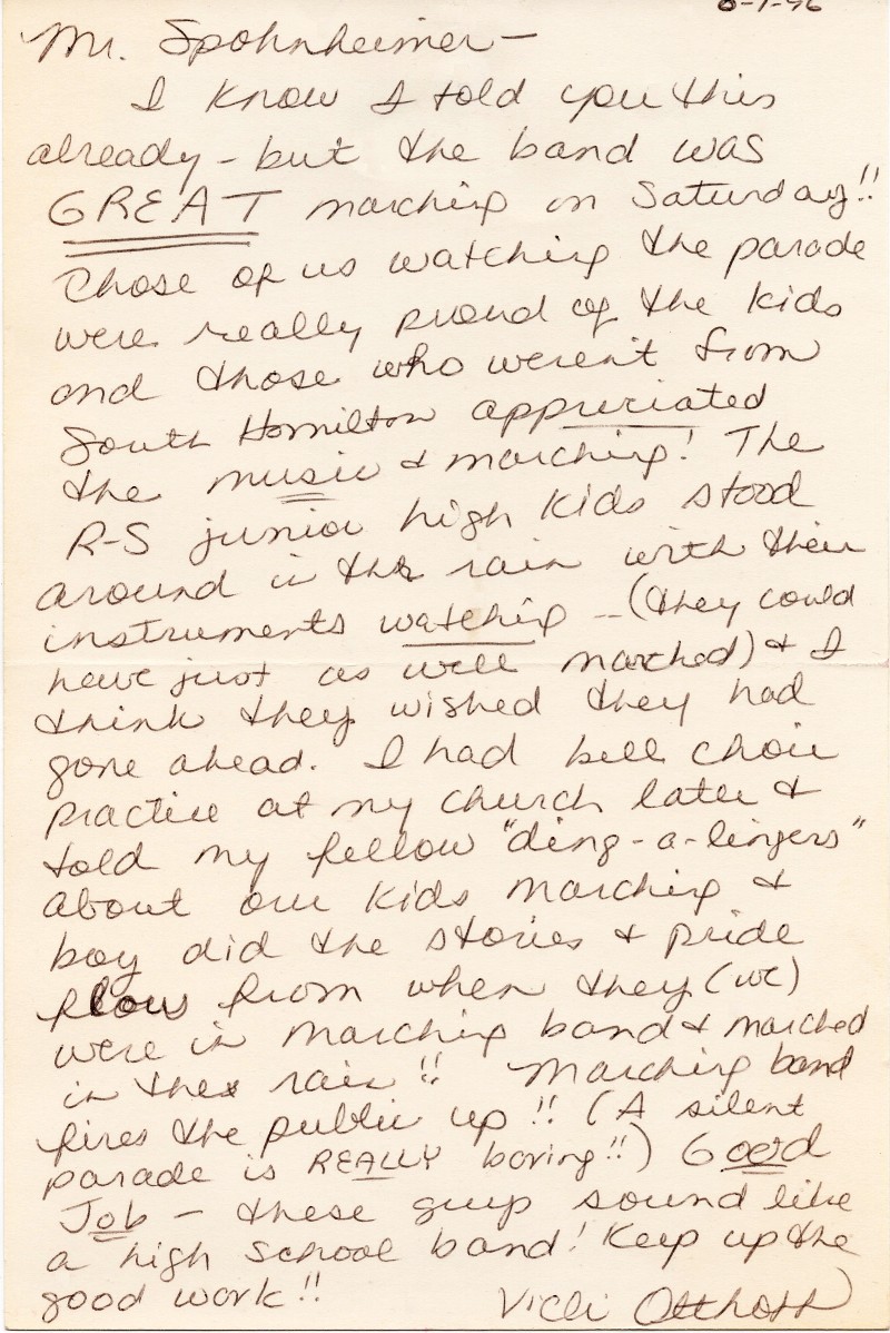 The rain came hard for a while, and soon it was 15 minutes until time for the parade to begin. Because it was nearly parade time, the director of Story City High School band left his bus and came into the South Hamilton bus to visit with the South Hamilton director. He mentioned that he had hoped for a great parade day, but with the rain coming down, the Story City High School band was going to call it quits for the day and not worry about marching on a rainy day. He asked, "What are you going to do?"