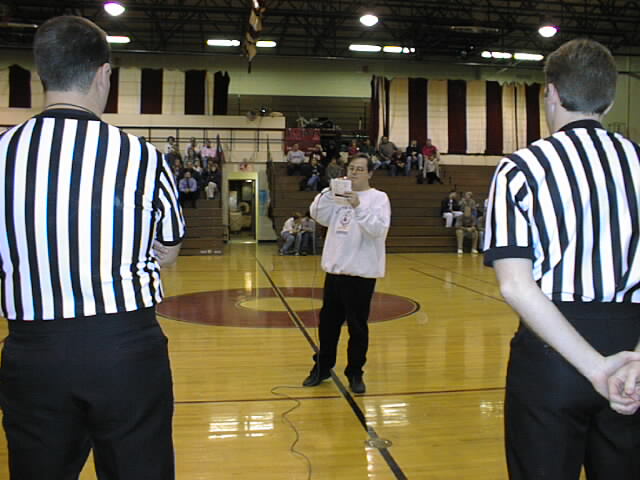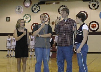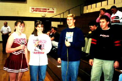 South Hamilton vocalists Brooke Olson, Dale Anderson, B.J. Bolluyt, and Liz Bourquin are pictured here treating the fans with the Star Spangled Banner in preparation for the January 19th basketball game with Roland-Story. Below is Hawk announcer Bill Bensen warming up the crowd.