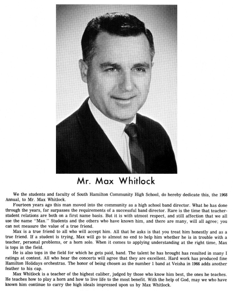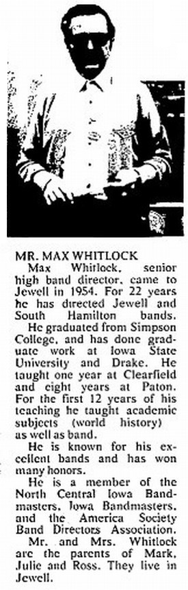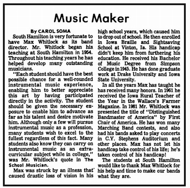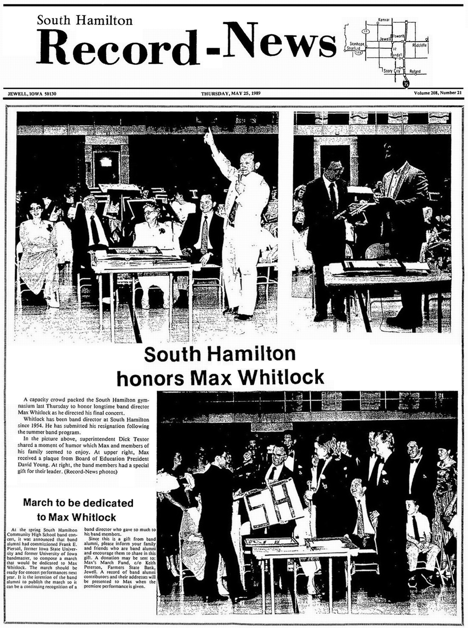 South Hamilton commissions piece in honor of former band director Max Whitlock certainly made an impression on his band students at South Hamilton Junior Senior High School. Former students of Whitlock have honored their former director by commissioning a musical piece to be performed by the 100-member concert band Thursday at an 8:30 p.m. concert in the high school gym in Jewell. Whitlock was director of the high school's band for 26 years until retiring last spring. "Whitlock was a popular figure at first Jewell, and then South Hamilton School, during his long career there, exerting positive influence on several generations of students," said Jane Arends, a member of the South Hamilton Band Alumni. "Bands under his direction won many awards over the years, with South Hamilton enjoying a strong music program in which a large percentage of high school students participated. Arends said Whitlock, who still lives in Jewell, had such a profound effect upon his students that alumni, hearing of Whitlock's retirement, decided to honor him in some way. "We announced the decision to commission a work at Max's retirement concert last May and started soliciting money from former band members across the country," Arends said. She said response to the plea was "exceptional." "Max's March" was written by Frank Piersol, a former band director at Iowa State University and the University of Iowa. He has written many band pieces and is specially fond of marches. "He's written a lot of (athletic) halftime shows and is kind of an institution in Iowa. He's directed festival bands and all-state bands for years," said current South Hamilton Band Director Dean Pelz about Piersol. The decision to commission a march was a natural. Pelz said Whitlock's favorite band tunes are the marches of Fort Dodge native Karl King - "Iowa's March King." "Former students remember Whitlock's love for marches, so commissioning 'Max's March' to be written for him seemed a proper tribute by the alumni," Arends said. Arends said her son Andy originally sparked the idea for the composition. "My son is a student at Harvard. They have what's called 'host parents' there and his host parents were involved in a community band. They told him they always commission pieces and her thought it would be kind of neat to do one for Max," Arends said. Collecting the $600 for the work was easy, Arends said, because so many of the former students consider "Max" their friend. "Max did more than just teach music," Arends said. "Sometimes during class they'd all just sit around and 'philosophize' about something. He was really a friend and so many of his students keep in contact with him still, calling him and writing him letters. All four of my boys have stayed close to him after graduation." Former students have also stayed close to music after leaving Whitlock's tutelage. The school has produced several college music majors and 75 to 80 percent of the student population participates in band, from fifth grade through senior year. Whitlock's own son plays in the U.S. Army Band stationed in Indianapolis, Ind. Pelz