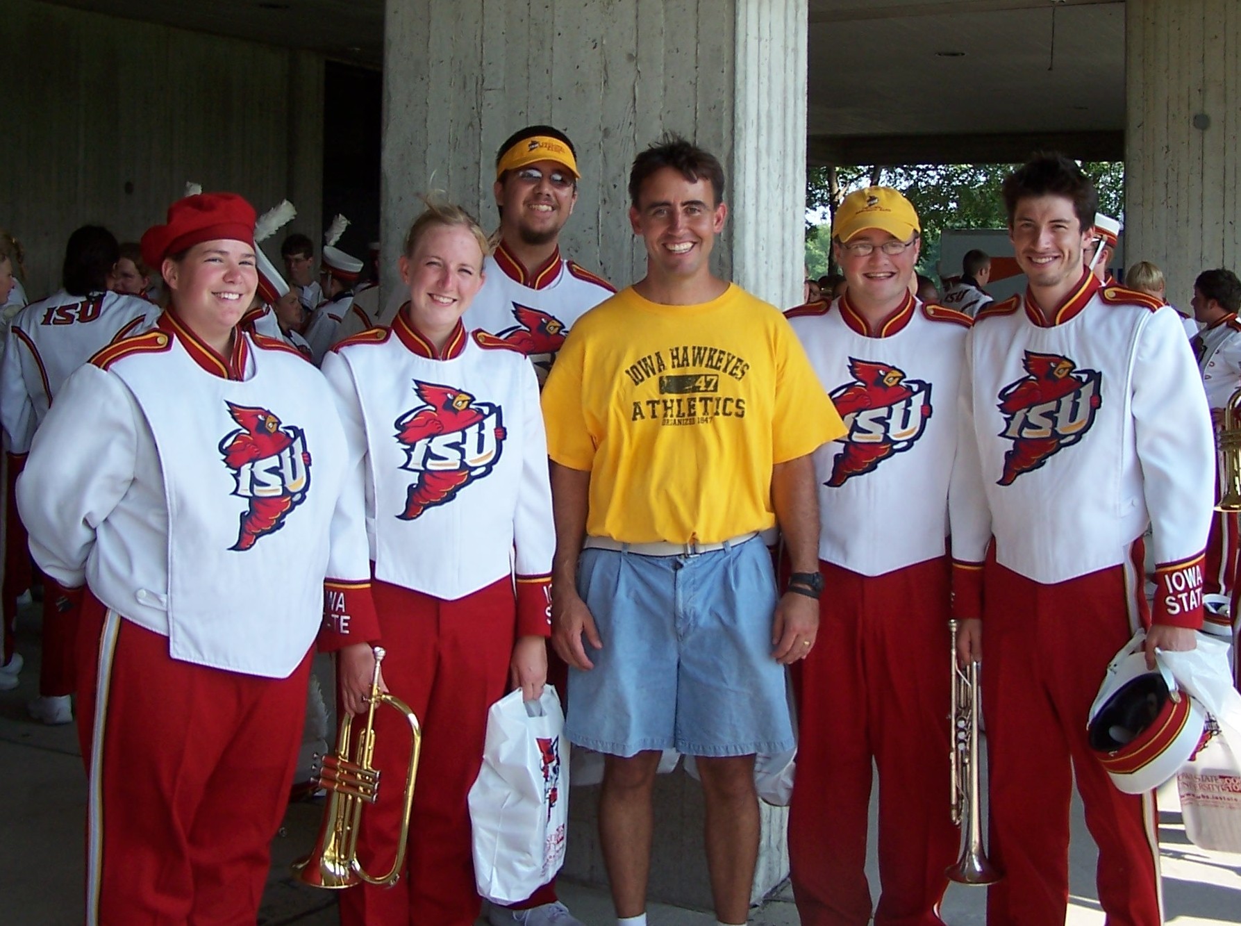 This photo shows director Mr. John Carey surrounded by his five former students from South Hamilton, who are performing with the Iowa State University Marching Band in 2006. The students are Lynsey Carlson, Melanie Wilson, Jeremiah Evans, Ross Schumaker, and Kent Spohnheimer.