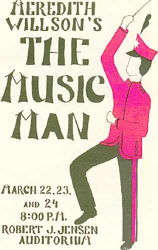 The music man is a swindler named Harold Hill, who goes from town to town selling the idea of forming a local boys' band. He says he is ready to train it if the town buys from him all the necessary equipment. However, since Hill cannot read a note of music and knows nothing about training a band, he absconds with the money as soon as he has made the sale. He comes to the town of River City, Iowa, where his easy spiel wins the townsfolk. But when their suspicions are momentarily aroused, he overcomes the incredulity of a committee sent to investigate his credentials by inducing them to form a barbershop quartet. The monebank, however, is foiled by two unforseen developments. He falls in love with the local librarian-piano teacher, Marian Paroo -- the only one who really knows he is a con man but is willing to ignore this unsavory fact because she loves him. The other development is the contagious spirit generated in the town for song and dance which even infects our charlatan. He has a change of heart and falls in line with the rest of the town. In the final scene the boys appear in full regalia with their instruments to sound the first sour notes of their band music.