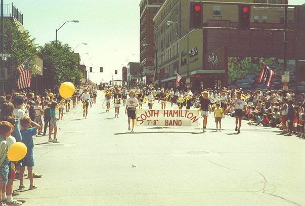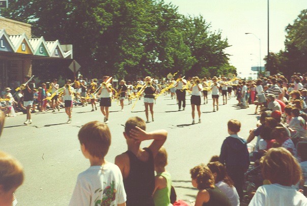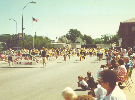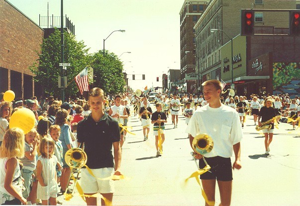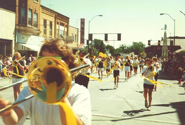 Most bands in the Fort Dodge Frontier Days parade were high school bands wearing their uniforms. Because the South Hamilton Middle School band didn't have uniforms, the all students would decorate their horns with crepe paper streamers of the same color. All watching the parade could tell the band was unified by wearing their unofficial uniforms.