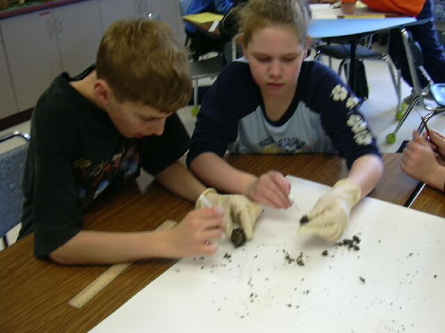 Sixth grade students dissected owl pellets during science class. Owl pellets are vomited out of an owl's first stomach. Mrs. Hall found some of the pellets in her backyard and we ordered the rest. We found that the pellets contained bones of mice, gophers, voles, moles, and shrews. We estimated that one owl eats about 1,095 animals a year which is about 3 each day! The sixth graders also attended an owl seminar in the ICN lab and we learned all about owls native to Iowa and how to make owl calls. You can hear the sounds owls make if you go to owlpages.com on the internet. We plan to listen for owls and look for pellets when we go to Springbrook Conservation Center in May.
