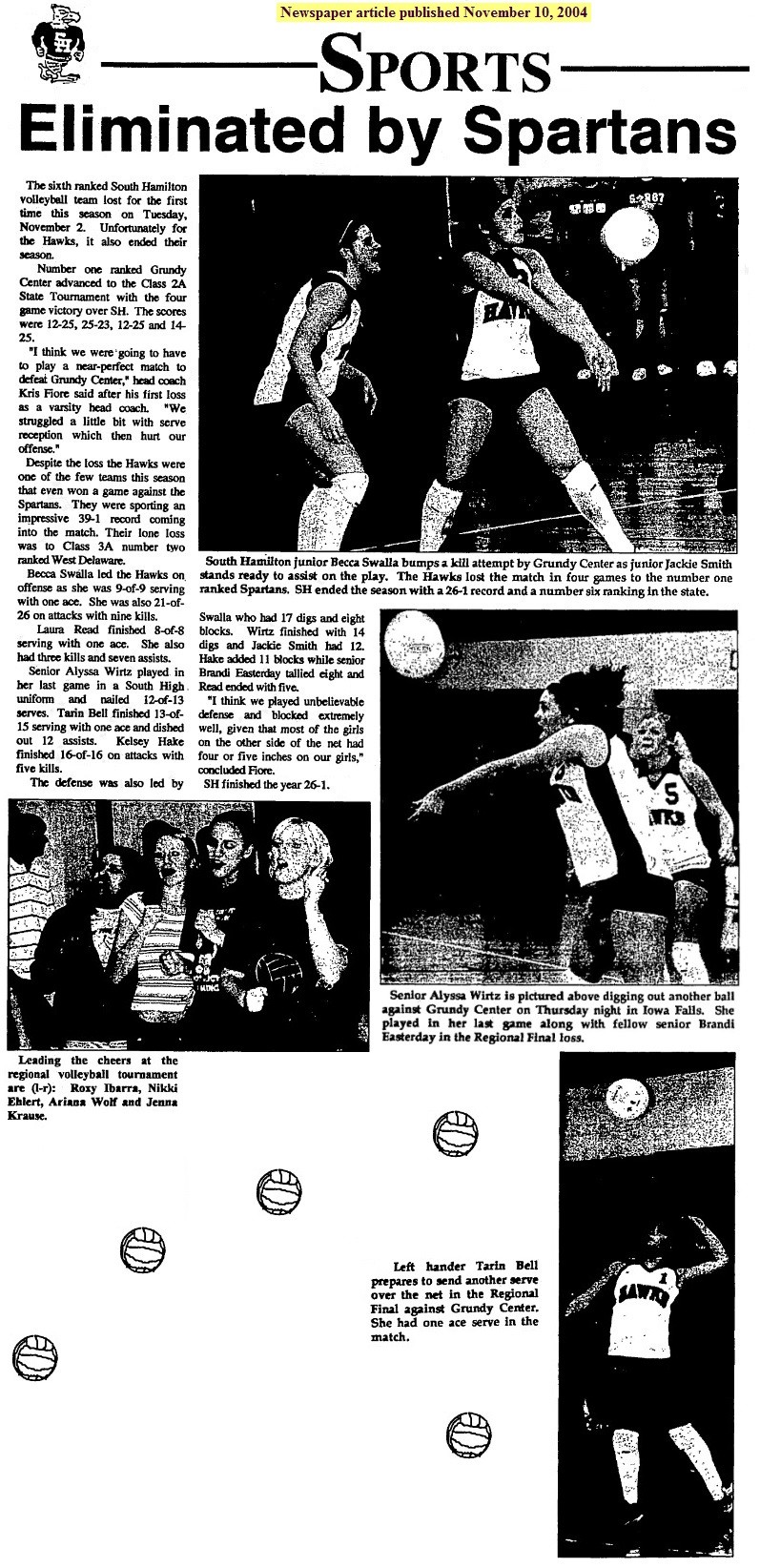 Semi-finals --- The Hawks played fellow HOIAC member Bondurant-Farrar in the semi-finals and knocked off the Bluejays in two games. The scores were 21-14 and 21-14. Wirtz led the offense against the Bluejays as she had three aces. Hake was perfect serving going 9-for-9. Bell finished with 17 assists while Read added 11. The defense was led by Hake who had three blocks followed by Easterday with two. Swalla also had two blocks and three digs. Bell, Wirtz and Smith finished with two digs each. Finals --- In the finals, the Hawks squared off agains Johnston again and this time South High won the match in two games. The scores were 21-8 and 21-12. Leading the way on offense was Tarin Bell who nailed three aces, was 10-of-25 serving and dished out 13 assists. Kelsey Hake added two aces and tallied four kills. Laura Read finished with nine assists and two kills. Becca Swalla was perfect serving and good on 9-of-10 attacks. Jackie Smith finished with one ace. Defensively, Easterday finished with three