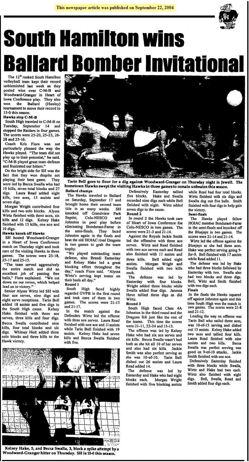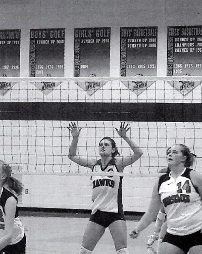 The 12th ranked South Hamilton volleyball team kept their record unblemished last week as they posted wins ovr C-M-B and Woodward-Granger in Heart of Iowa Conference play. They also won the Ballard (Huxley) tournament to move their record to 15-0 this season.... Hawks stop C-M-B --- South High traveled to C-M-B on Tuesday, September 14 and stopped the Raiders in four games. The scores were 25-20, 25-23, 26-28 and 25-16. On the bright side fir SH was the fact that they won despite not playing their best game. They were led by Becca Swalla who had 10 kills, seven total blocks and 27 digs. Laura Read added eight kills, two aces, 15 assists and seven digs. Morgan Wright contributed four kills and two solo blocks. Alyssa Wirtz finished with three aces, six kills and 12 digs. Kelsey Hake finished with 13 kills, one ace and 10 digs. Hawks knock off Hawks --- SH hosted Woodward-Granger in a Heart of Iowa Conference match on Thursday night and took care of the visiting Hawks in three games. The scores were 25-18, 25-17 and 25-15. "The team served aggressively the entire match and did an excellent job of passing free balls," Jiore explained. "We cut down on our errors, which helped lead us to victory." Senior Alyssa Wirtz led SH with four ace serves, nine digs and eight serve receptions. Tarin Bell added 18 assists ad five digs to the South High cause. Kelsey Hake finished with three ace serves, three kills and four digs. Becca Swalla contributed nine kills, four total blocks and six digs. Whitney Holt added three solo blocks and three kills to the Hawk victory.... Ballard champs --- The Hawks traveled to Ballard on Saturday, September 17 and brought home their second team title in as many weeks. SH knocked off Grandview Park Baptist, Colo-NESCO and Johnston in pool play before eliminating Bondurant-Farrar in the semi-finals. They gaced Johnston again in the finals and beat the old HOIAC rival Dragons in two games to grab the team trophy. "We played outstanding team defense, also Brandi Easterday and Kelsey Hake led a great blocking effort throughout the day," coach Fiore said. "Alyssa Wirtz's serving kept teams on their heels all day." Round 1 --- South High faced highly regarded GVPB in the first round and took care of them in two games. The scores were 21-15 and 21-17. In the match against the Defenders, Wirtz led the offense with three ace serves. Laura Read finished with one ace and 11 assists while Tarin Bell finished with 19 assists. Kelsey Hake had seven kills and Becca Swalla finished with five. Defensively Easterday tallied five blocks. Hake and Swalla recorded nine digs each while Bell finished with eight. Wirtz added siven digs to the cause. Round 2 --- In round w, the Hawks took care of Heart of Iowa Conference foe Colo-NESCO in two games. The scores were 21-3 and 21-14. Against the Royals Jackie Smith led the offense with three ace serves. Wirtz and Read finished with two ace serves each and Read also finished with 11 assists and three kills. Bell added eight assists. Morgan Wright and Swalla finished with two kills each. The defense was led by Easterday with four blocks. Wright added three blocks while Swalla added four digs. Janessa Hove tallied three digs as did Wirtz. Round 3 --- South High faced Class 4A Johnston in the third round and the Dragons fell just like the rest of the teams. This time the scores were 21-11, 22-24 and 15-13. The offense was led by Kelsey Hake who had six ace serves and six kills. Becca Swalla wasn't bad both as she hit all 10 of her serves and also had six kills. Jackie Smith was also perfect serving as she was 10 out of 10. Tarin Bell dished out 26 assists and Laura Read added 14. The defense was led by Easterday and Hake