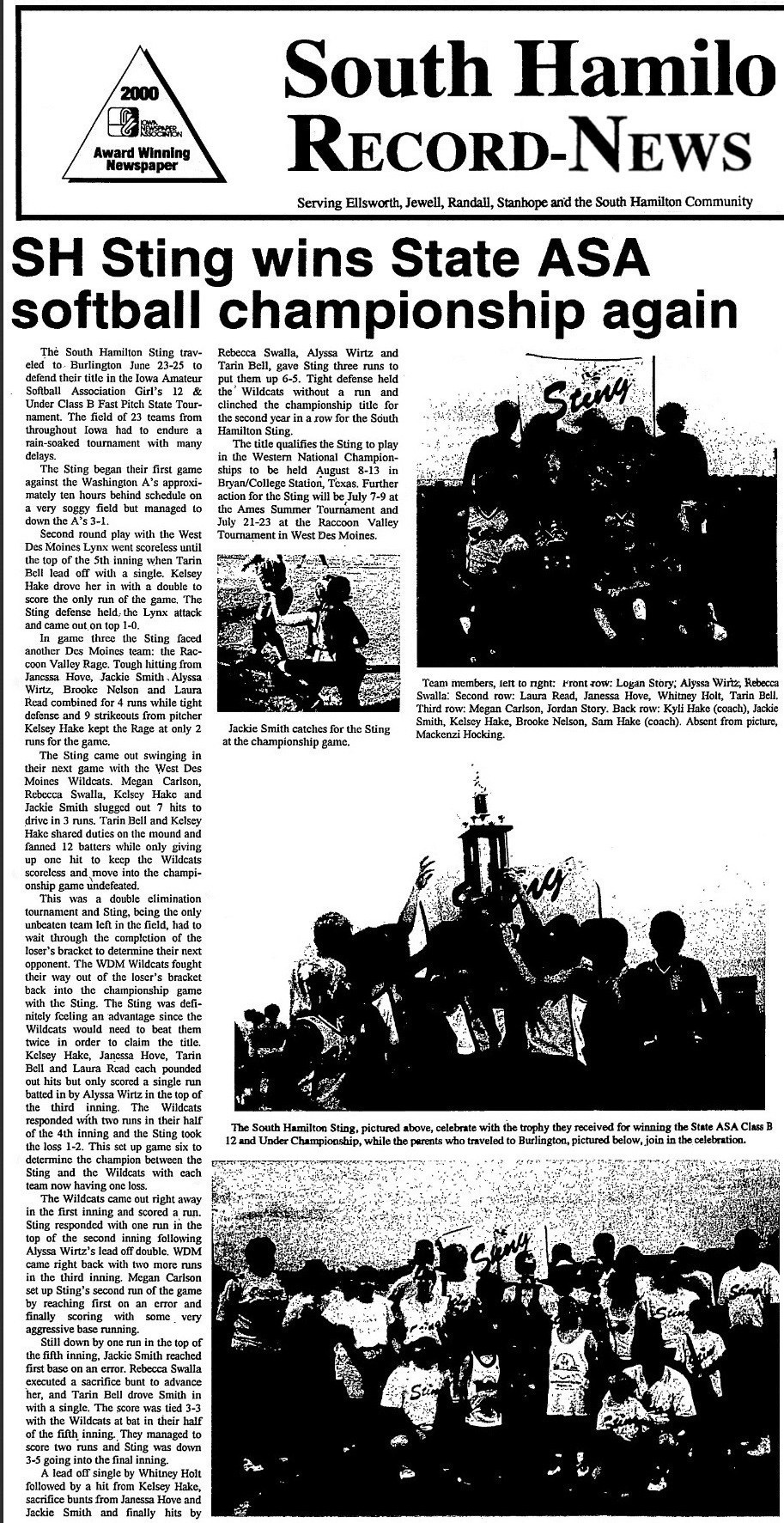 The South Hamilton Sting traveled to Burlington June 23-25 to defend their title in the Iowa Amateur Softball Association Girl's 12 & 13 Under Class B Fast Pitch State Tournament. The field of 23 teams from throughout Iowa had to endure a rain-soaked tournament with many delays. The Sting began their first game against the Washinton A's approximately ten hours behind schedule on a very soggy field, but managed to down the A's 3-1. Second round play with the West Des Moines Lynx went scoreless until the top of the 5th inning when Tarin Bell led off with a single. Kelsey Hake drove her in with a double to score the only run of the game. The Sting defense held the Lynx attack and came out on top 1-0. In game three the Sting faced another Des Moines team: the Raccoon Valley Rage. Tough hitting from Jenessa Hove, Jackie Smith, Alyssa Wirtz, Brooke Nelson and Laura Read combined for 4 runs while tight defense and 9 strikeouts from pitcher Kelsey Hake kept the Rage at only 2 runs for the game. The Sting came out swinging in their next game with the West Des Moines Wildcats. Megan Carlson, Rebecca Swalla, Kelsey Hake and Jackie Smith slugged out 7 hits to drive in 3 runs. Tarin Bell and Kelsey Hake shared duties on the mound and fanned 12 batters while only giving up one hit to keep the Wildcats scoreless and move into the championship game undefeated. This was a double elimination tournament and Sting, being the only unbeaten team left in the field, had to wait through the completion of the loser's bracket to determine their next opponent. The WDM Wildcats fought their way out of the loser's bracket back into the championship game with the Sting. The Sting was definitely feeling an advantage since the Wildcats would neet to beat them twice in order to claim the title. Kelsey Hake, Janessa Hove, Tarin Bell and Laura Read each pounded out hits but only scored a single run batted in by Alyssa Wirtz in the top of the third inning. The Wildcats responded with two runs in their half of the 4th inning and the Sting took the loss 1-2. This set up game six to determine the champion between the Sting and the Wildcats with each team now having one loss. The Wildcats came out right away in the first inning and scored a run. Sting responded with one run in the top of the second inning following Alyssa Wirt's lead off double. WDM came right back with two more runs in the third inning. Megan Carlson set up Sting's second run of the game by reaching first on an error and finally scoring with some very aggressive base running. Still down by one run in the top of the fifth inning, Jackie Smith reached first base on an error. Rebecca Swalla executed a sacrifice bunt to advance her, and Tarin Bell drove Smith in with a single. The score was tied 3-3 with the Windcats at bat in their half of the fifth inning. They managed to score two runs and Sting was down 3-5 going into the final inning. A lead off single by Whitney Holt followed by a hit from Kelsey Hake, sacrifice bunts from Janessa Hove and Jackie Smith and finally hits by Rebecca Swalla, Alyssa Wirtz and Tarin Bell, gave Sting three runs to put them up 6-5. Tight defense held the Wildcats without a run and clinched the championship title for the second year in a row for the South Hamilton Sting. The title qualifies the Sting to play in