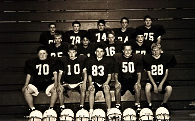 This is the seventh grade team picture. Front Row: Will Dunn(70), Nathaniel Feldman(10), Scott Andrews(83), Chaz Olson(50), Josh Oakland(28). Second Row: Adam Olson(35), Jacob Covarrubias(21), Brandon Rholl(16), Dustin Dwyer (57). Third Row: Ryan Rowe(88), Ross Schumaker(78), Michael Thompson(74), Keith Pittman(34), Tim Herschberger(75).